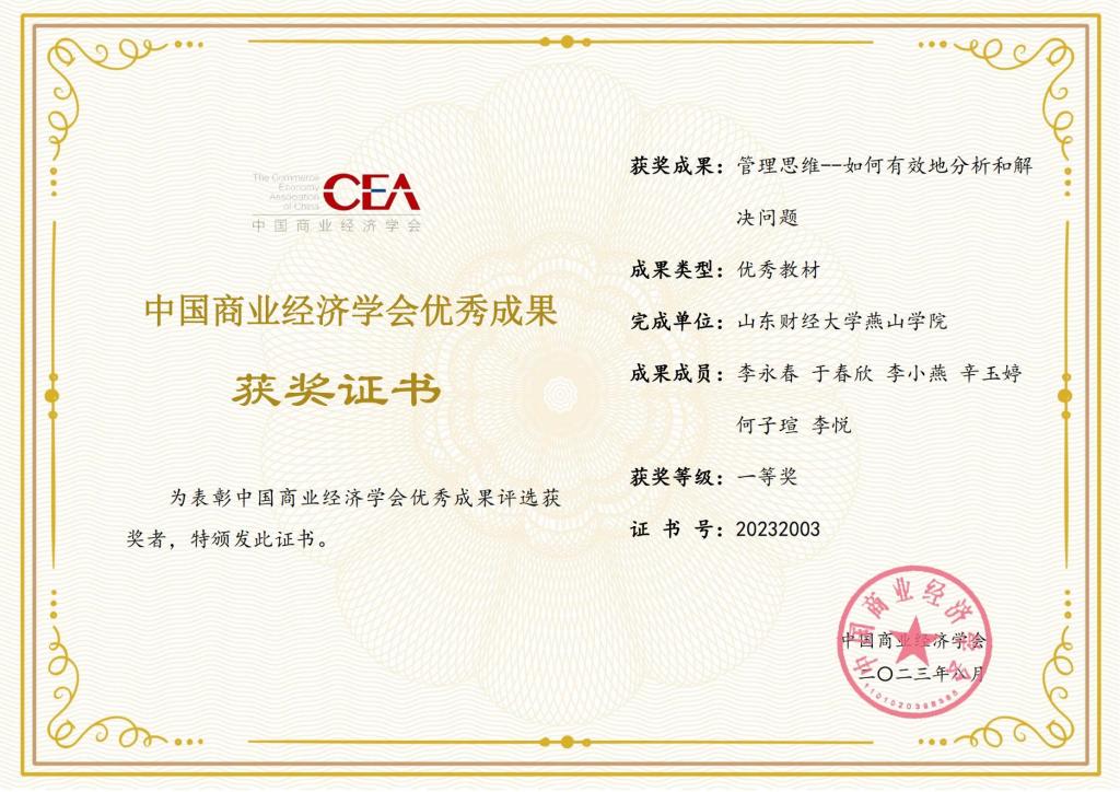在剛剛結(jié)束的中國商業(yè)經(jīng)濟(jì)學(xué)會(huì)2023年度優(yōu)秀成果評獎(jiǎng)活動(dòng)中,由6776永利集團(tuán)院長李永春教授主編的教材《管理思維---如何有效地分析和解決問題》榮獲優(yōu)秀教材一等獎(jiǎng)。同時(shí),在8月份進(jìn)行的山東省第十五屆大學(xué)生科技節(jié)活動(dòng)中,6776永利集團(tuán)李永春、劉金煒指導(dǎo)的學(xué)生組榮獲山東省大學(xué)生智慧企業(yè)管理創(chuàng)新設(shè)計(jì)大賽數(shù)字商業(yè)企業(yè)模擬經(jīng)營對抗賽道一等獎(jiǎng)。另外,在前不久公布的山東省教育科學(xué)研究院組織的2023年度山東省教育教學(xué)研究課題...